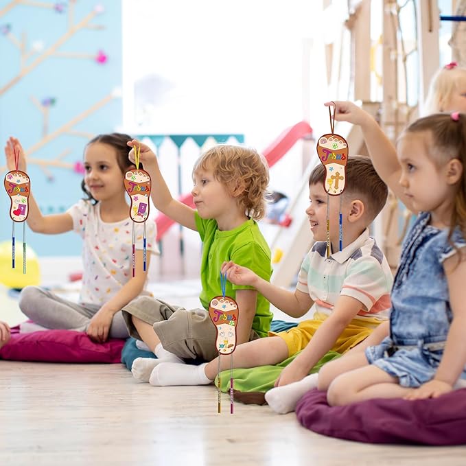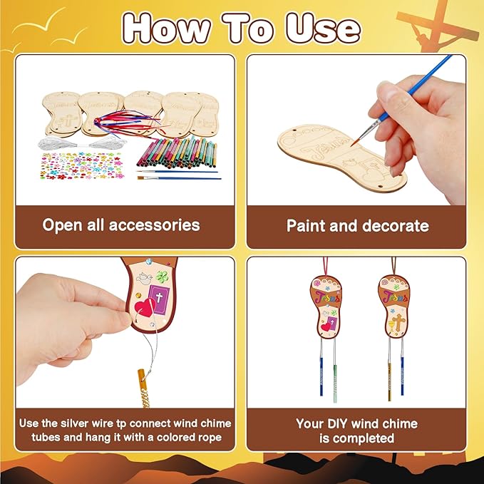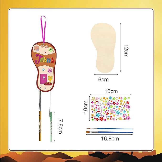 - Christmas Jesus Craft Kit for Kids:the DIY wooden jesus wind chimes kit for kids include 12 x unfinished wooden Jesus slippers,24x wind chime tubes(4colors, 6 for each color),2x painting brushes(there no paint included),12x 1M silver wire,12 x color rope,1x rhinestone sticker.Sufficient quantity and various styles to meet your needs,kids can make their own wind chime kit to delightfully share or as an interactive activity in the classroom.