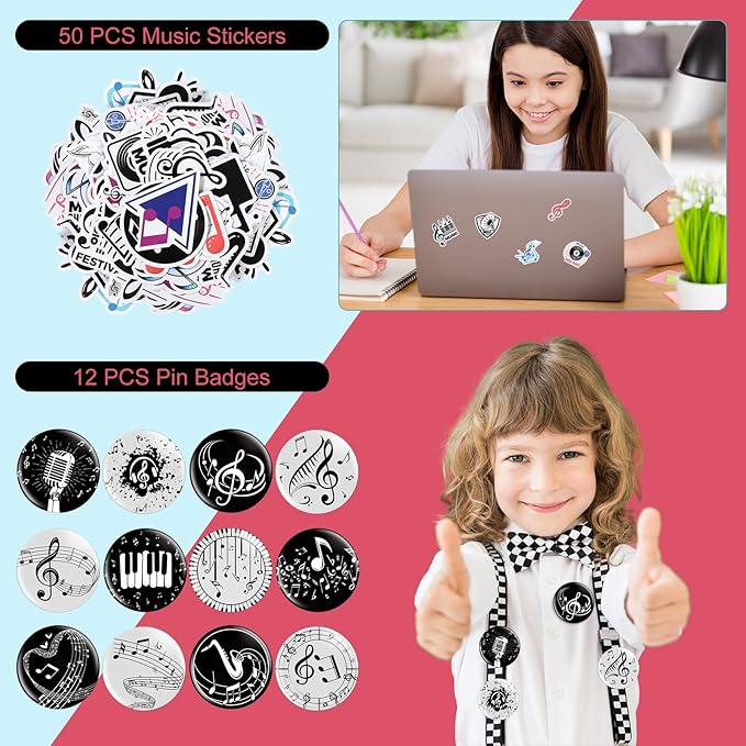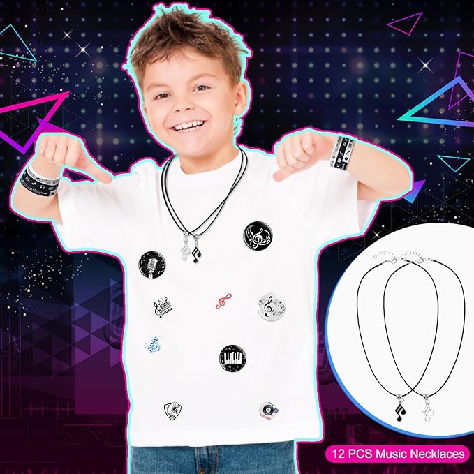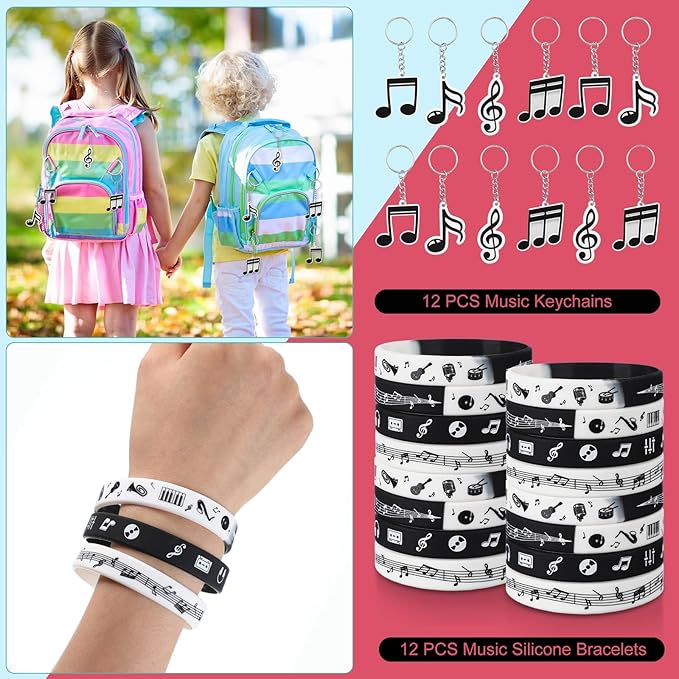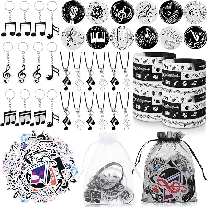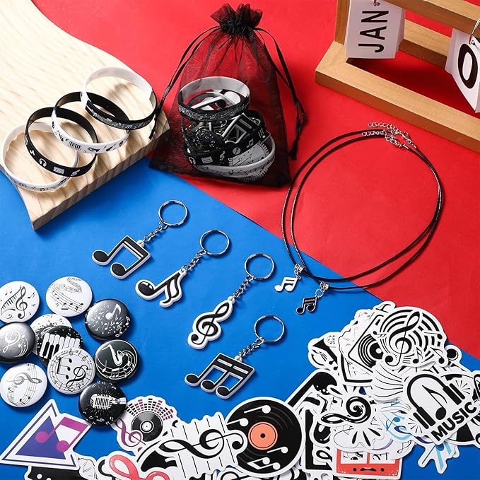 - Music Party Favors Bulk: you will get 110 pieces of music theme party supplies, including 12 pieces of music notes silicone bracelets, 12 pieces of musical note necklaces, 12 pieces of keychains, 12 pieces of pin badges, 12 pieces of organza bags, 50 pcs music stickers, various styles and sufficient quantities to meet your party decorations needs