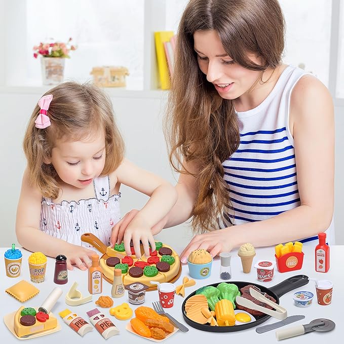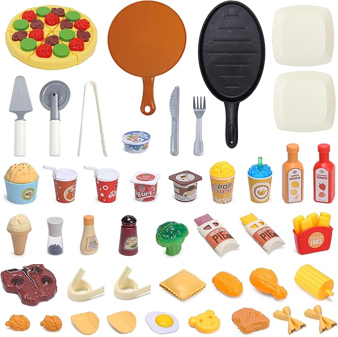 - Comprehensive Kitchen Toys for a Complete Cooking Experience: Our food playset with 44 pieces of realistic toy foods, desserts, and toy kitchen accessories, including pizza, steak, ice cream, and a true-to-size frying pan, your child can immerse themselves in the joy of cooking. It's like having a real kitchen just for them