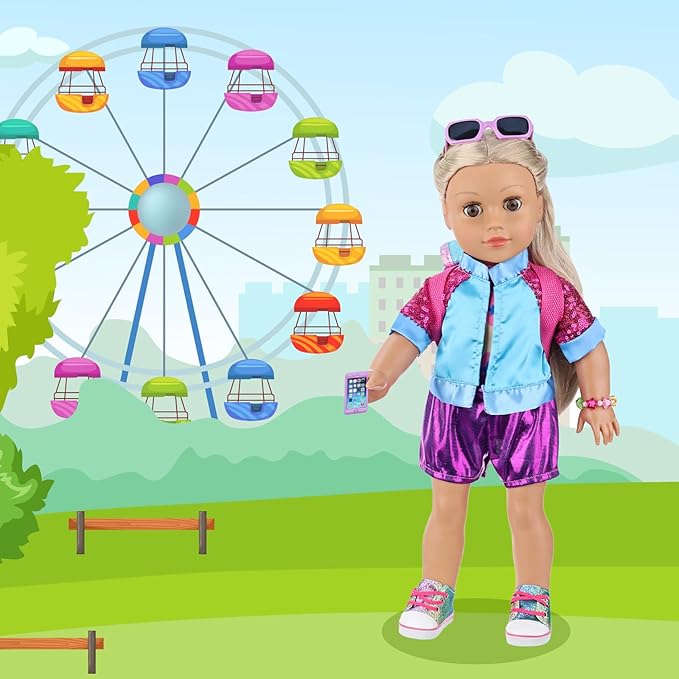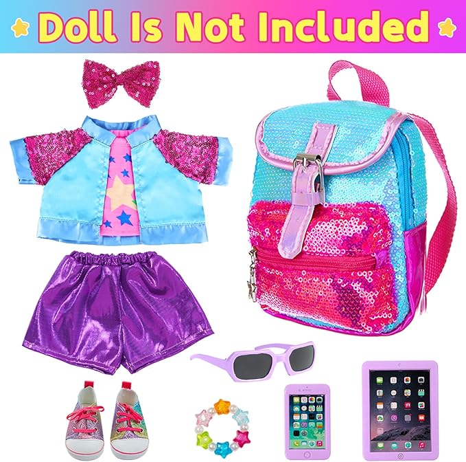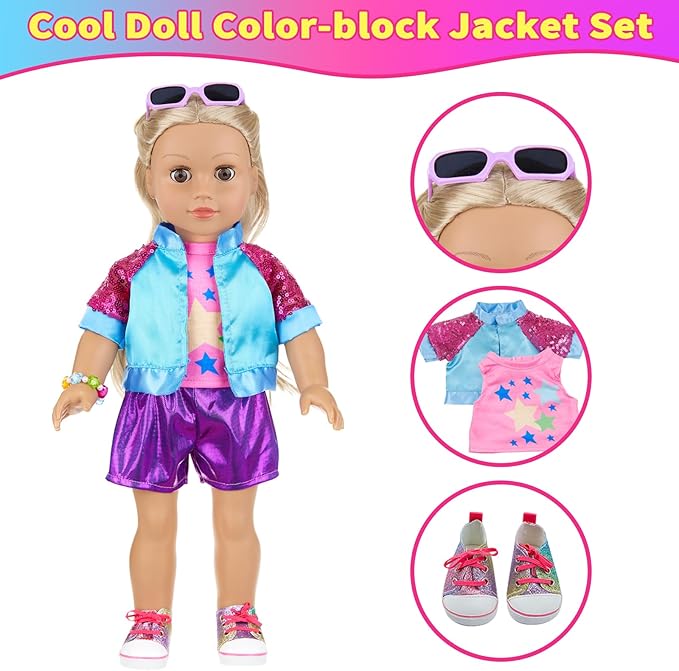 - Package List: 10 pcs 18 inch doll clothes and accessories set - 3 pcs Color Blocking Jacket Set, 1 gradient doll backpack, 1 pair of shoes, 1 bow hair clip, 1 purple framed sunglasses, 1 bracelet, 1 toy tablet, 1 toy phone.