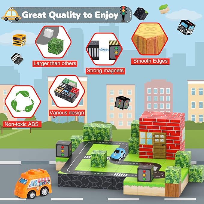 • CITY THEME: Step into the magical world of city road with our Magnetic Blocks set! This 110-piece set features vibrant magnetic blocks with 6 adorable cars, sparking endless creativity and fun for kids.