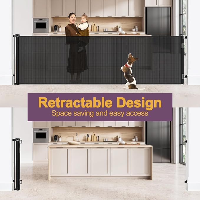 - Suitable for Indoor and Outdoor Wide Openings: Our extra tall and wide retractable baby gate is suitable for indoor open kitchens, bottom of stairs, doorways, hallways and outdoor decks, patios, garages and more.