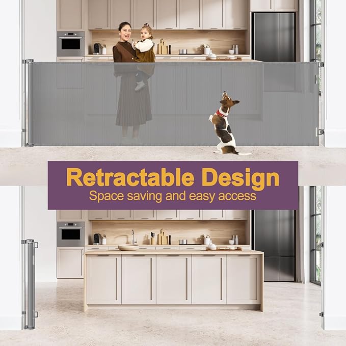 - Suitable for Indoor and Outdoor Wide Openings: Our extra tall and wide retractable baby gate is suitable for indoor open kitchens, bottom of stairs, doorways, hallways and outdoor decks, patios, garages and more.