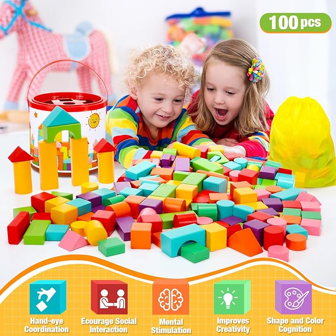 Libima 100 Pcs Wood Building Blocks for Toddlers 2-4 Years with Storage Container Wooden Building Blocks Wooden Building Set Wooden Building Set Preschool Block Learning Toys