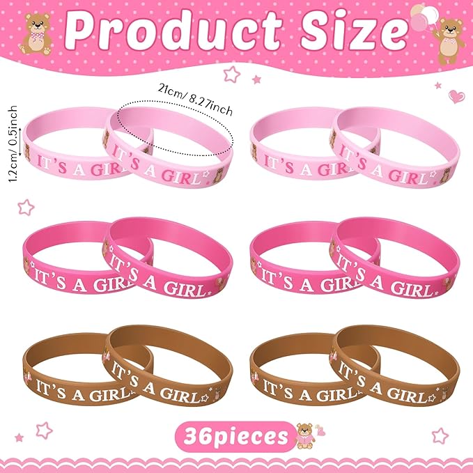 Zomiboo 36 Pieces Baby Shower Rubber Bracelets, It's a Boy It's a Girl Wristbands Elephant Baby Shower Decorations for Boy Girl Baby Shower Party Favor Gender Reveal Party Supplies (Pink Bear Style)