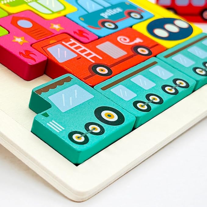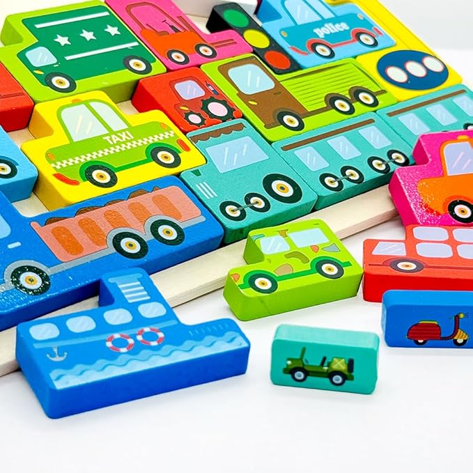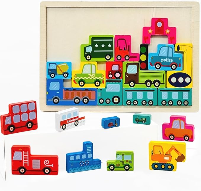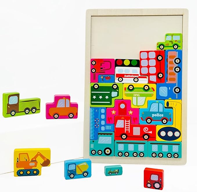 Wooden Blocks Puzzle Russian Blocks for Kids Age 3 4 5 Years Old, Children's Puzzle Game Board Learning Education Montessori Toddler Puzzle Wooden Toys for Kids Birthday Party Gift (Vehicle)