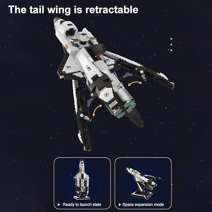 - 【Intimate and Detailed Design】 The tail fin is uniquely designed and can be extended and switched between shapes. When the tail fin is closed, it enters the launch preparation state, and when unfolded, the tail fin is in space deployment mode, making you feel like you are in a real space exploration. This building block space shuttle can not only be displayed as a whole, but can also be divided step by step to display different structural forms, bringing you a richer gameplay experience.