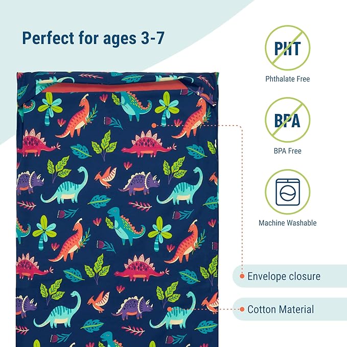 Wildkin Kids Nap Mat Cover for Boys & Girls, Featuring Sewn-in Flap Design, Ideal for Preschool and Daycare, Fits Our Vinyl Nap Mat up to 1.5 Inches Including Basic Sleep Mat - Darling Dinosaurs
