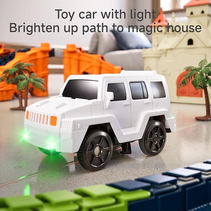 - 🏎️Magic Castle Race Track Toy -This magic castle track toy combines magic and racing themes for an exciting adventure! The track toy set comes with everything you need, including 160 x flexible race tracks, 2 x divert track, 2 x electric racing cars, 1 x magic house, 1 x bridge ramps, 1 x tunnels, 1 x magic door, 1 x wooden bridge, 2 x bat. Children can use their imagination to connect the tracks and build a wonderful world.