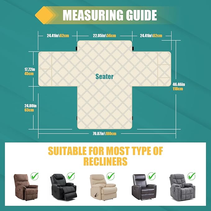 - DIMENSIONS GUIDE: The recliner seat cover fits a chair sitting width of 22 in/56 cm, footrest length of 24.8 in/63 cm, Please measure your chair according to the pictures on the product page