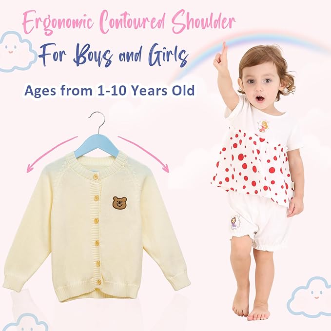 - Child-friendly Design & Gentle on Clothes: Well-polishing childrens hangers with smooth finish will protect little hands. No rough edge and burr on the child hangers' surface to avoid scraping delicate clothes.