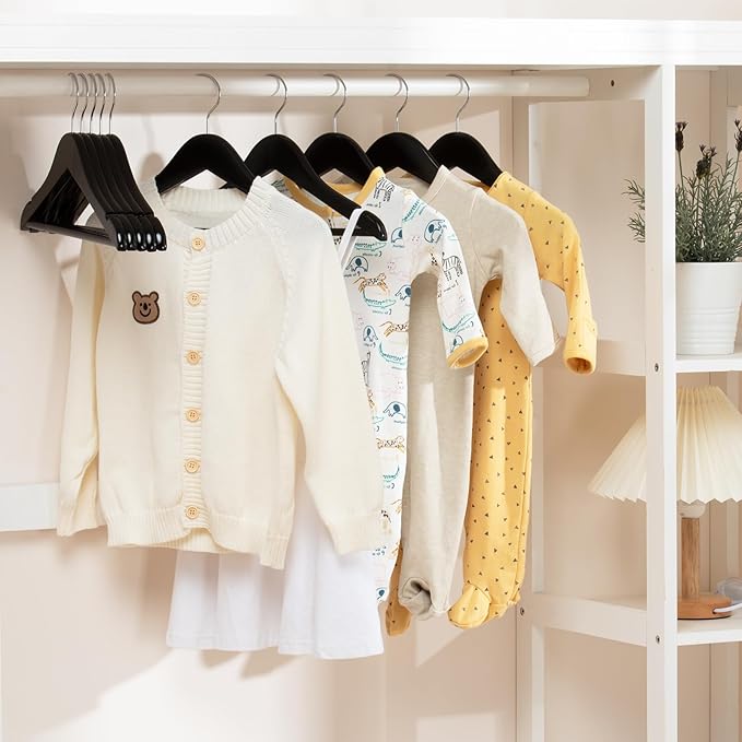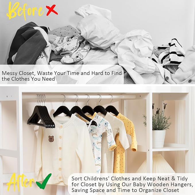 - Natural Wooden Kids Hangers: Our kids hangers are made of high-graded maple wood with sturdy triangle shape for long time use, coated in black lacquer for added protection decorates. The timeless black color adds a touch of sophistication to your child's closet, ensuring a sleek and stylish look.