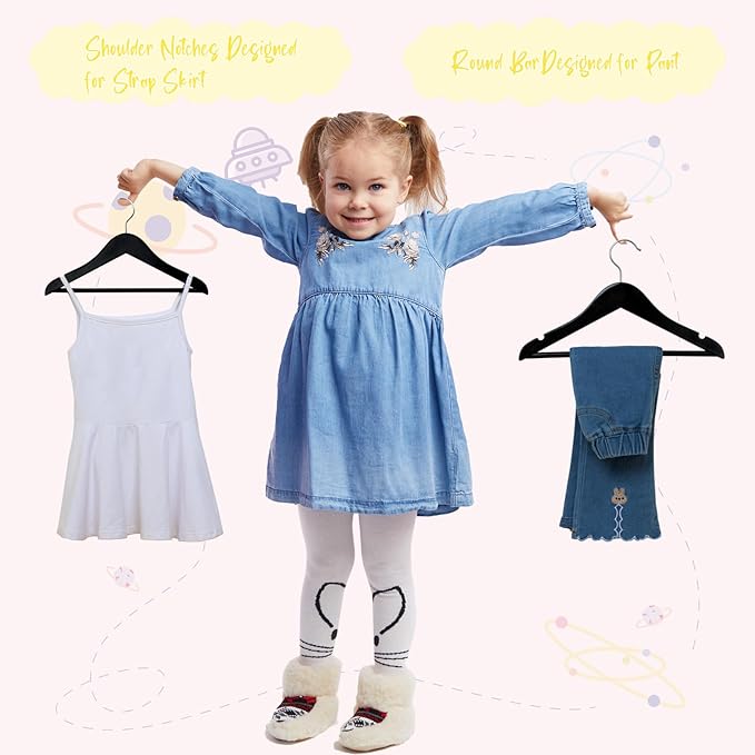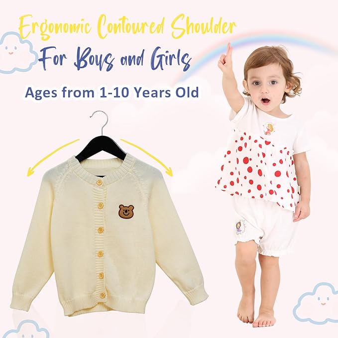 - Child-friendly Design & Gentle on Clothes: Well-polishing childrens hangers with smooth finish will protect little hands. No rough edge and burr on the child hangers' surface to avoid scraping delicate clothes.