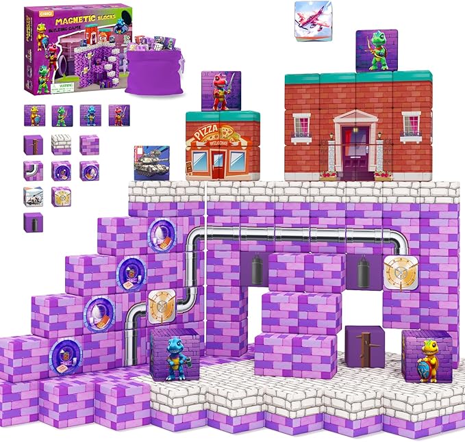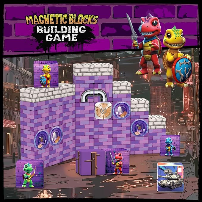 - ● Magnetic Blocks - Dinosaur Adventure Games: Dive into a magnetic action-packed world with our unique magnetic blocks set! The magnetic blocks features four brave dinosaur heroes and vivid city buildings. Kids will get magnetic toys to build their vibrant magnetic blocks cityscape like lively restaurant house and cozy rest area. Unleash your kids' creativity and enjoy hours of role-play fun with these magnetic cubes!