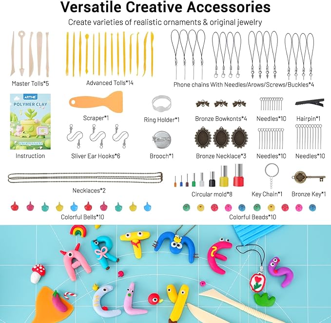 - COMPLETE CLAY TOOLS AND CREATIVE ACCESSORIES: Comes with rich clay tools, bells, beads, earring hooks, hairpin holder, brooch holder, ring holders, key ring, needles, mobile phone chains, user manual, and more. You can make any DIY project you want with these accessories easily. They are all in a sturdy box that is easy for storing and carrying.