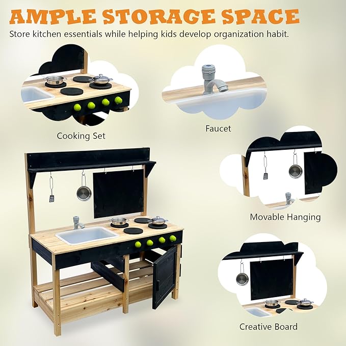• Solid Pine Wood Material: Crafted from high-quality pine wood, our outdoor mud kitchen ensures durability and safety. Designed for toddlers aged 3 and above, it provides a secure and worry-free play environment.