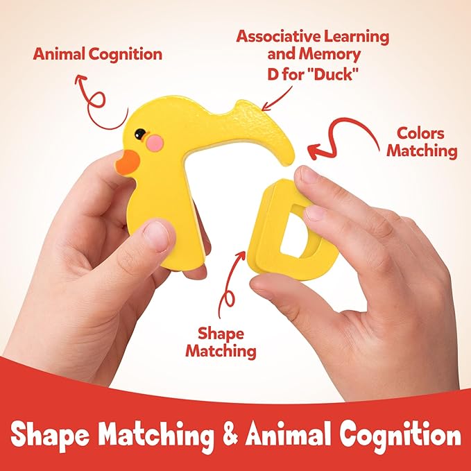 - FUN MATCHING SURPRISE: This 52pcs kids wooden alphabet puzzle set is super fun! Contains 26 colorful uppercase letters, 26 cute animals, and 2 portable storage bags. Each letter of the alphabet corresponds to a unique animal block, so your child can easily master the alphabet through matching, starting a joyful learning journey.