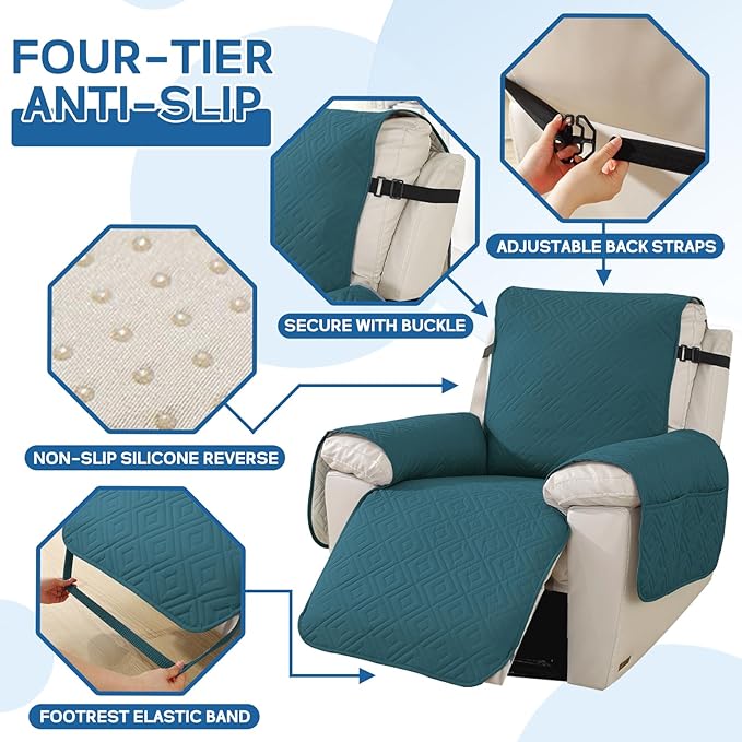 - 【Stay-Put Assurance】Fourfold Anti-Slip Innovation! 1. Solid round colloid design on the back of our recliner slip cover; 2. Additional flexible elastic straps for the headrest; 3. Two elastic bands at seat's back side and the matching buckle; 4. elastic straps for footrest to reduce the sliding of the reclining chair cover, even on the leather furnitures.