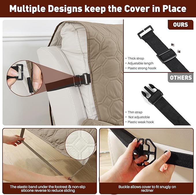 - 【Upgraded Anti-slip Design】Tired of recliner covers that won't stay in place? Experience our Fourfold Anti-Slip Innovation! Backed by anti-slip silicone particles and three elastic straps tailored for the headrest, lumbar, and footrest, your cover stays firmly anchored without any wandering. You can rest assured that your children or pets can jump and play on it without needing to adjust the recliner slipcover every time.