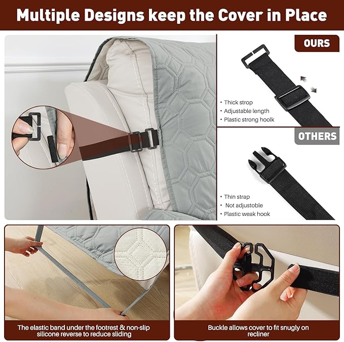 - 【Upgraded Anti-slip Design】Tired of recliner covers that won't stay in place? Experience our Fourfold Anti-Slip Innovation! Backed by anti-slip silicone particles and three elastic straps tailored for the headrest, lumbar, and footrest, your cover stays firmly anchored without any wandering. You can rest assured that your children or pets can jump and play on it without needing to adjust the recliner slipcover every time.