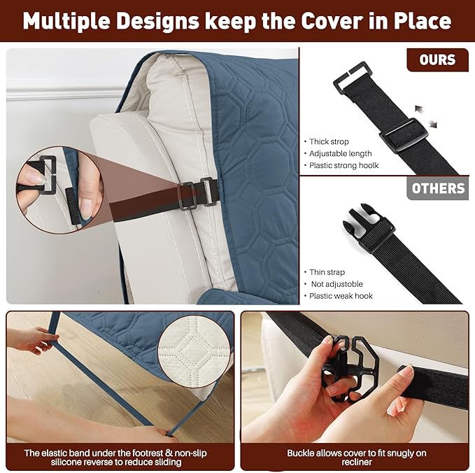 - 【Upgraded Anti-slip Design】Tired of recliner covers that won't stay in place? Experience our Fourfold Anti-Slip Innovation! Backed by anti-slip silicone particles and three elastic straps tailored for the headrest, lumbar, and footrest, your cover stays firmly anchored without any wandering. You can rest assured that your children or pets can jump and play on it without needing to adjust the recliner slipcover every time.