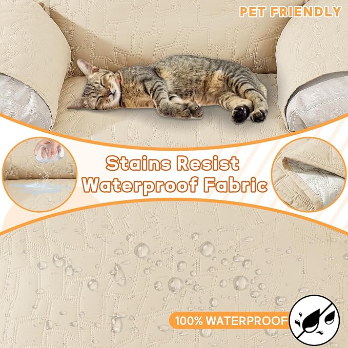XINEAGE 100% Waterproof Recliner Chair Covers with Elastic Straps, Nonslip Reclining Couch Covers Washable Recliner Couch Cover with Pockets Furniture Protector for Pets Dogs (Beige, 23")