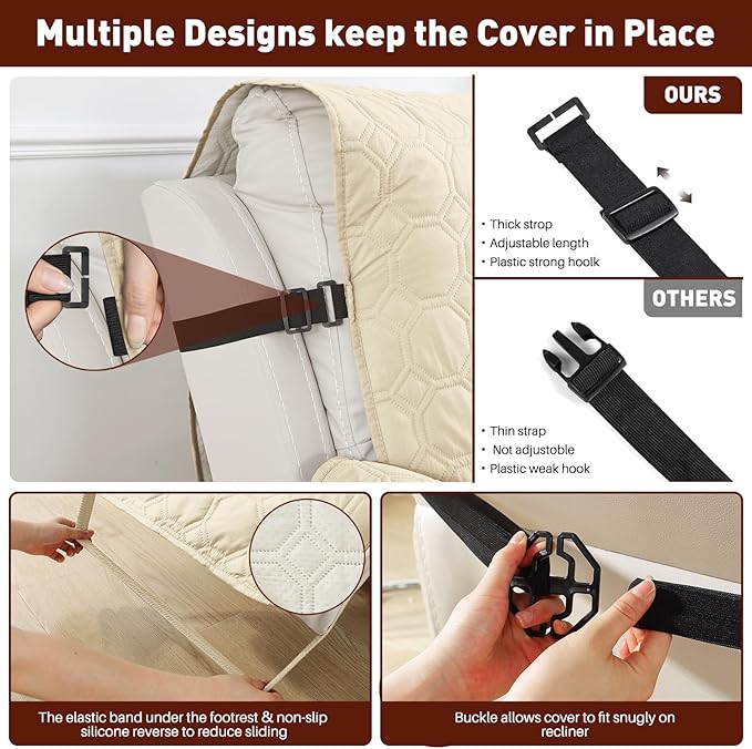 - 【Upgraded Anti-slip Design】Tired of recliner covers that won't stay in place? Experience our Fourfold Anti-Slip Innovation! Backed by anti-slip silicone particles and three elastic straps tailored for the headrest, lumbar, and footrest, your cover stays firmly anchored without any wandering. You can rest assured that your children or pets can jump and play on it without needing to adjust the recliner slipcover every time.