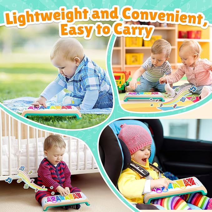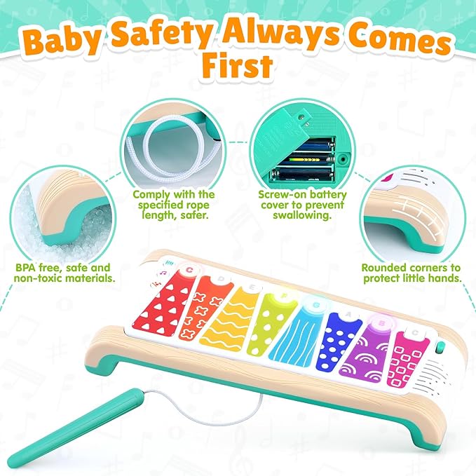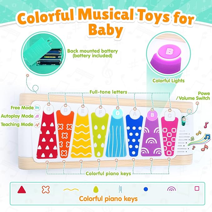 - Multiple Advantages - Firstly, 2 usage baby musical toy: touch and pen play. The touch is like playing the piano, just put hand on it to make a sound, it doesn't take any effort so baby won't lose interest. The pen stroke is like tapping the xylophone; Secondly, the musical toys for 1 year old has full-tone letters, "C.D.E.F.G.A.B", which can learn more baby music basics; Others, the volume can be controlled; Finally, it comes with batteries, no need to buy extra!