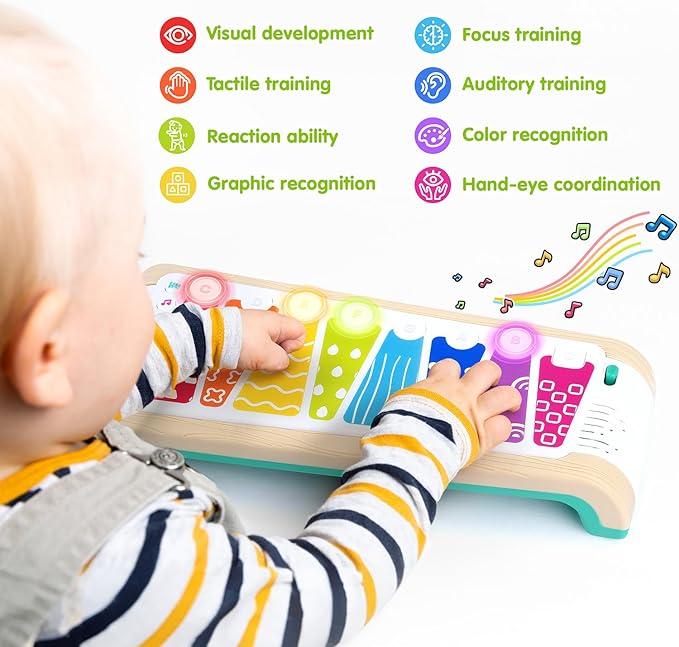 - Essential Early Education Music Toys - In the auto-play, the songs soothe the baby while cultivating a sense of music; in the teaching mode, 7 colors of keys correspond to 7 colors of lights, following the changing lights to promote the baby's visual development, cultivate concentration, hand-eye coordination, reaction ability and color & pattern recognition, dual training of touch and rhythm. In the free mode, keep baby engaged, explore and create his own music.