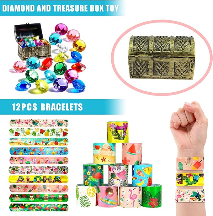 - Quantity:You will receive 12 keychains, 6 glasses, 10 party blowers, 12 slap bracelets, 6 water gun toys, 10 gyroscopes, 16 sticky toys, 10 diamond toys, 1 treasure chest, 4 swimming circle toys, 50 stickers.