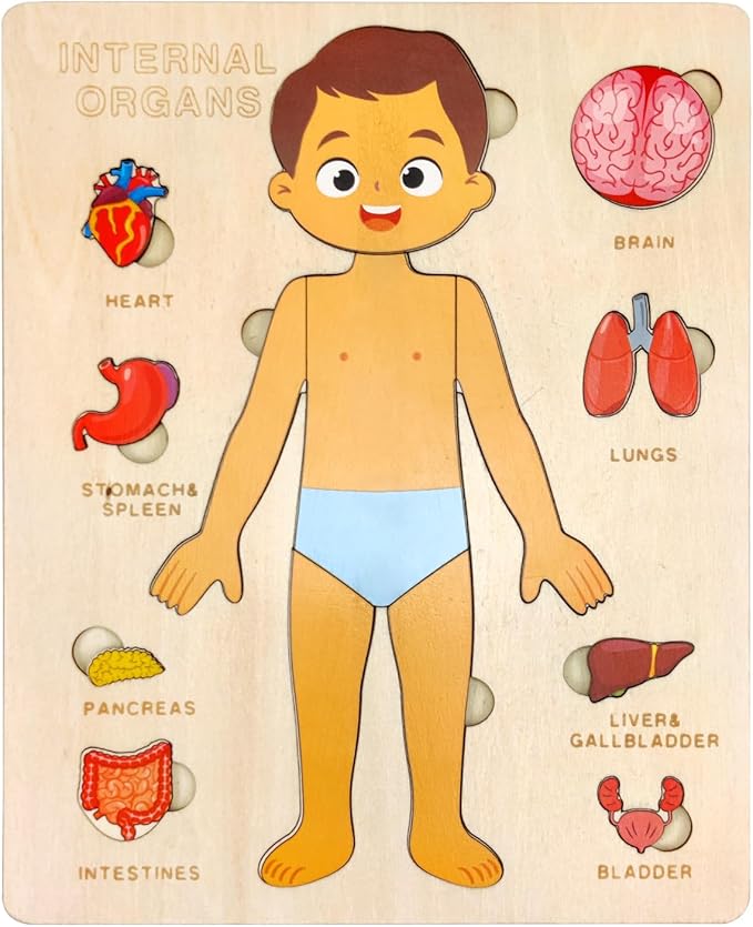 - 【Wooden Kids Anatomy Puzzle】This toddler puzzle contains not only external body parts, it also includes detailed internal organs: brain, heart, lungs, stomach, spleen, liver, gallbladder, pancreas, intestines, and bladder.