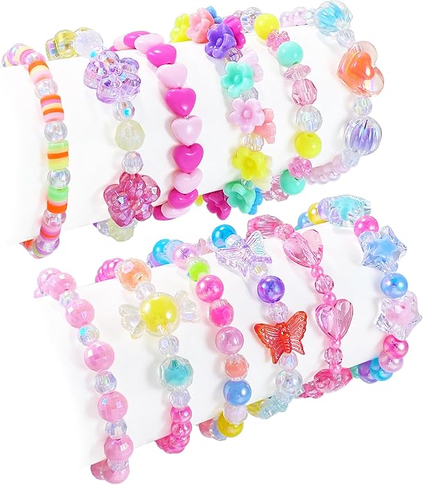 - Charming and Trendy: Our bracelet sets feature vibrant acrylic beads with an array of delightful designs, including multicolored patterns, flower, butterfly, adorable hearts, and stars. These playful accessories are for young fashion enthusiasts ages 3- 8 and make for an excellent birthday present or a sweet addition to any dress-up collection
