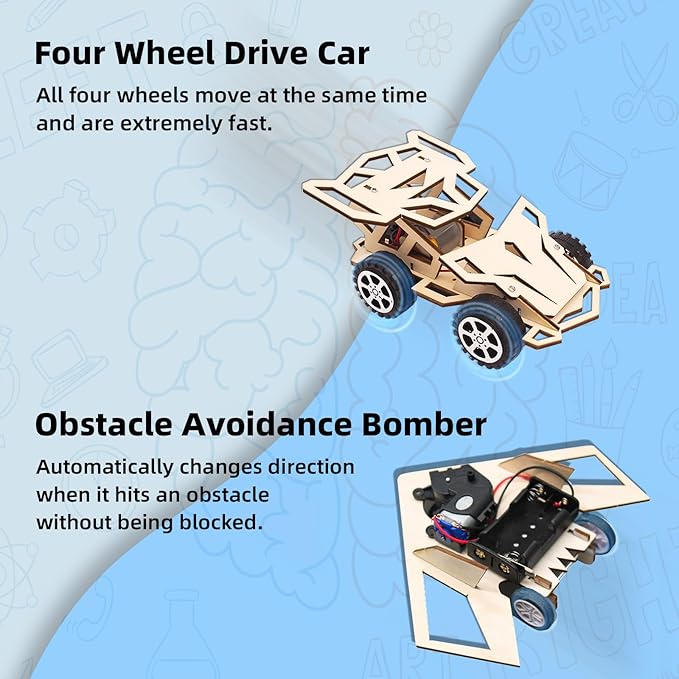 - STEM Kits for Kids: The Wooden Construction Kit includes 2 different kits for Four Wheel Drive Car and Obstacle Avoidance Bomber. Suitable for children aged 8 years and above, parental help or supervision is recommended.