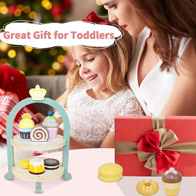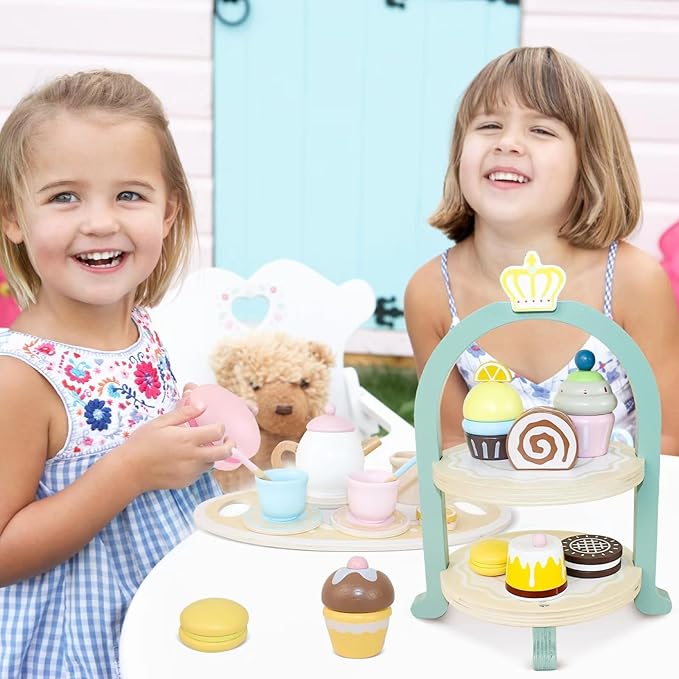 - UNIQUE AND STYLISH DESIGN: This tea set for little girls 4-6 features unique patterns and popular colors that appeal to young children. The wooden cake stand comes with a large storage capacity tray, helping children learn to organize and store their toys. It's a wonderful choice among wooden toys, combining beauty and functionality to encourage good habits in your child.