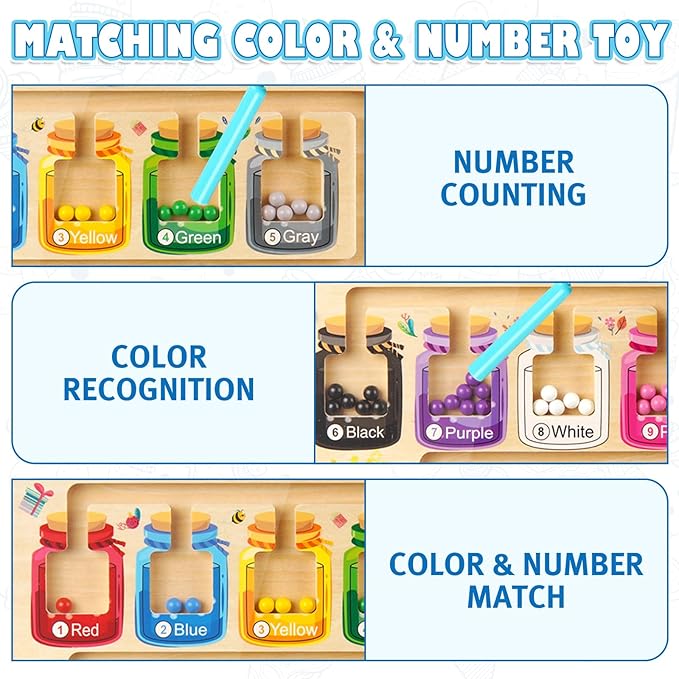 - 【Explore Colors and Counting】With its brightly colors, this toy can captivate the attention of children. Kids will have a blast as they move the beads of different colors to match the corresponding bottle , fostering their cognitive development and helps kids learn colors, teaches them counting and number recognition.