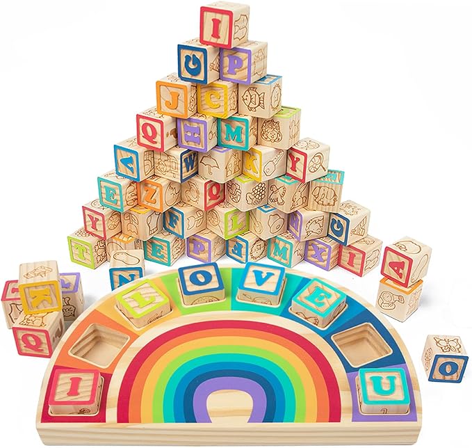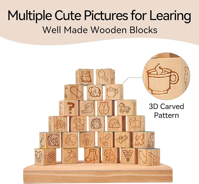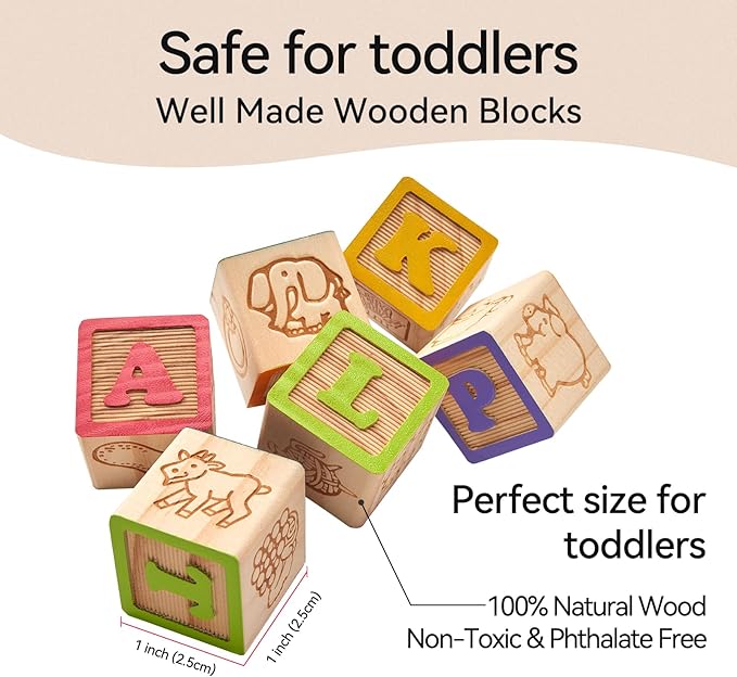 - Unique Design: 27 traditional-style solid wood blocks featuring animals, fruits and letters, the soft and soothing colours capture babies' attention and encourage visual development. Your baby will enjoy stacking and knocking them down, which is the best part! These blocks bring joy and developmental benefits to children.