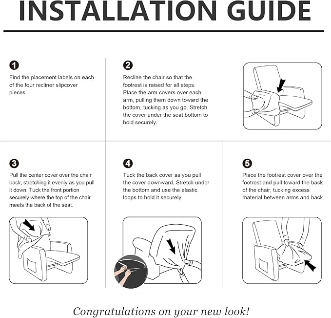 - EASY TO INSTALL: The small recliner cover includes 1 backrest cover, 1 footrest cover, and right and left arm covers. Effortlessly install in just a few minutes with the guide paper included in the package