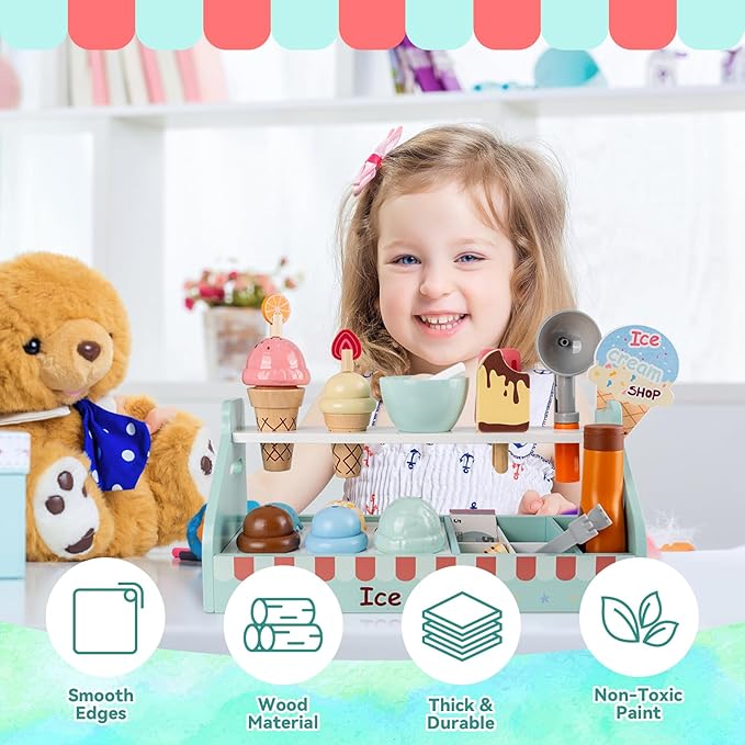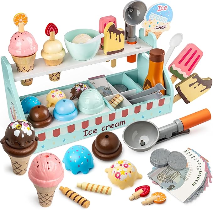 Wooden Ice Cream Toys for Kids, Commodum 43pcs Ice Cream Shop Counter Playset, Kids Pretend Kitchen Play Food Toys with Scoop & Fake Money, Wooden Toys for Toddlers Ages 3+, Christmas Birthday Gifts