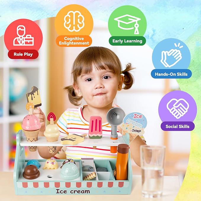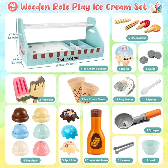 • 【All Inclusive Ice Cream Toy for Kids】Our wooden ice cream toy includes a wooden ice cream counter, 2 ice cream cones, 2 colorful popsicles, 6 toppings, 3 sprinkles, 4 decorations, 1 ice cream bowl, 1 spoon, 1 chocolate sauce, 1 scoop, 1 pair of tweezers, 14 play money, 6 coins and 1 brand. With 43 accessories for endless fun, children will be able to open an 'ice cream parlor' at any time! Have fun with the role play, kids!