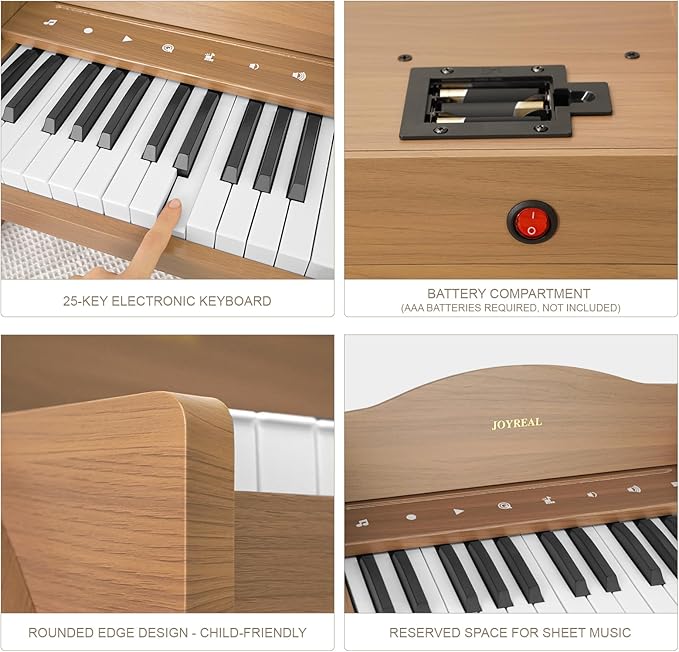 - 🎹【25 Key Digital Piano for Kids】 Joyreal toddler piano has 25 digital-tuned keys and 2 full octaves, making it an ideal choice for music beginners and helping children transition to a full-size piano. The sound of the kids piano is precisely produced electronically, providing a realistic sound experience without manual tuning. The baby piano is essential for children's learning in the early stages of music enlightenment and can inspire their interest and love for music.