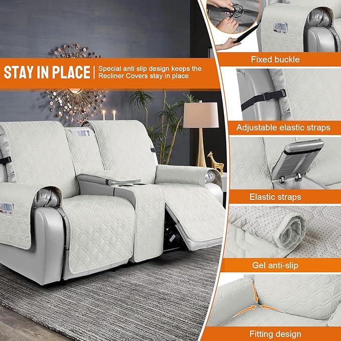 - STAY IN PLACE ANTI-SLIP DESIGN: Colloid design on the back of the recliner covers reduce slipping. Elastic straps on the top secure the back of the reclining chair. Elastic straps on the back with round buckle enhance slip resistance. Stays in place even on leather furniture