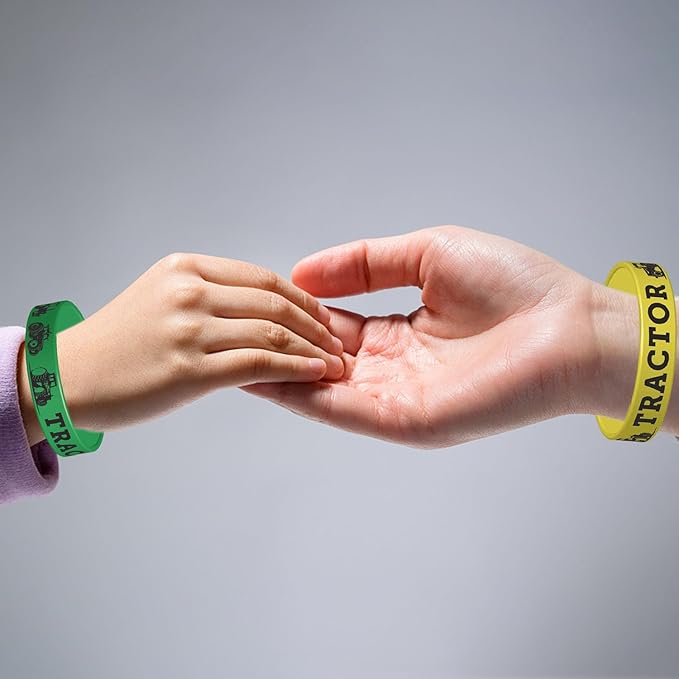 - The novel design of the themed rubber bracelets is printed with an image of a tractor in four colours: blue, green, blue and yellow. These bracelets are simple and adorable, and are suitable for your classmates and friends.
