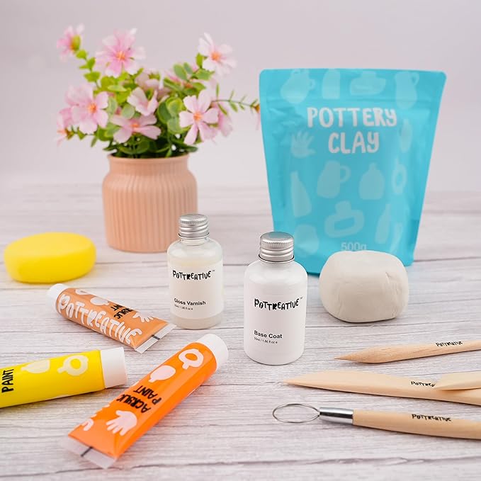 - All-Inclusive Pottery Tool Kit: Equipped with a full range of tools, including a step-by-step guide, clay sculpting tools, 4*500g premium air-dry clay, base coat,waterproof matte varnish,3* bristle paintbrushes and potter’s sponge,this kit provides everything needed for pottery creation.