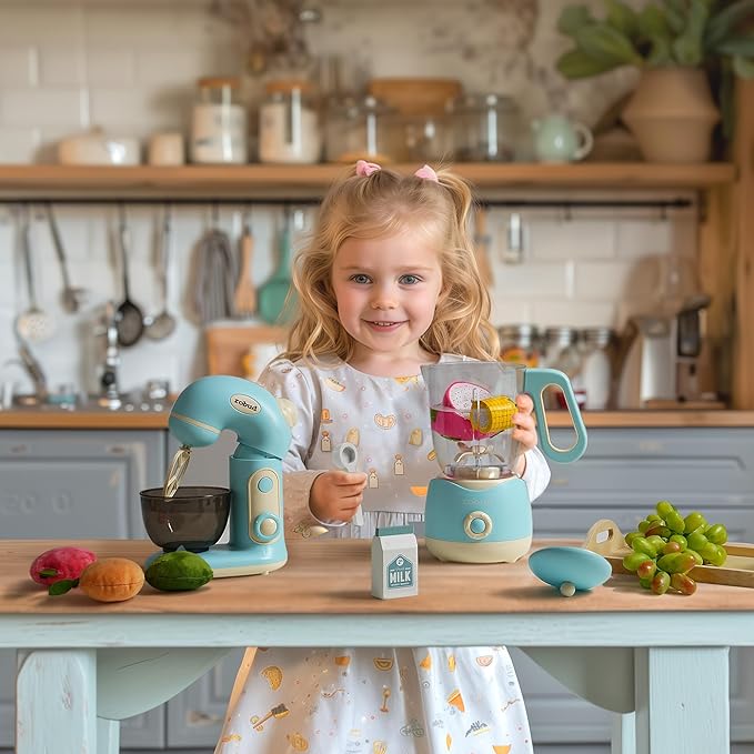 - CUTE DESIGN: With a soft combination of blue and beige, this toy juicer and mixer set has an adorable look. Its design not only attracts children but also stimulates their imagination. Whether it's used to decorate a playroom, as a daily toy, or as a charming play kitchen accessory, it is a delightful item full of appeal.