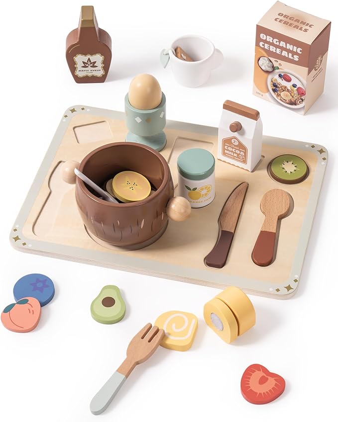 - REALISTIC FOOD SET: Includes 30+ wooden pieces such as avocado, cereals, eggs, fruits, maple syrup, and juice. Kids can serve up pretend meals using the utensils, pot, and plate, encouraging hours of interactive kitchen fun.