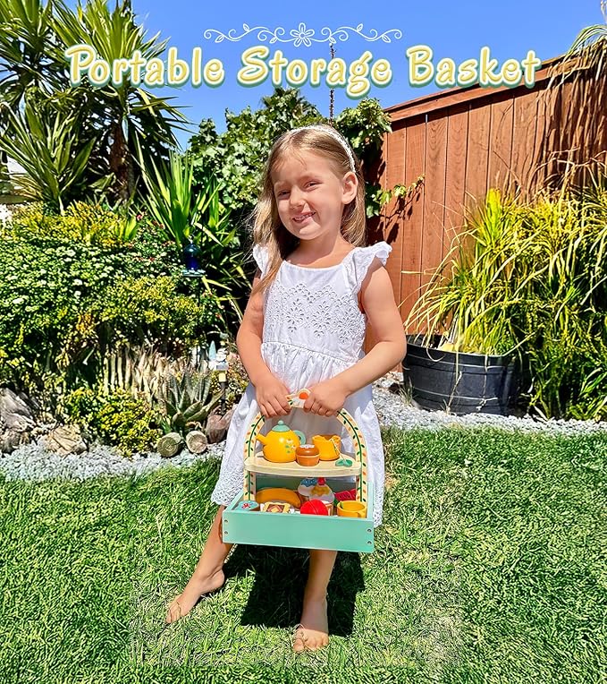 Wooden Tea Set for Toddlers Girls, Tea Party Set Food Pretend Play Kitchen Playset for 3 4 5 6 Years Little Girls, Jeowoqao Portable Princess Tea Party Toys Gifts with Cutting Fruit