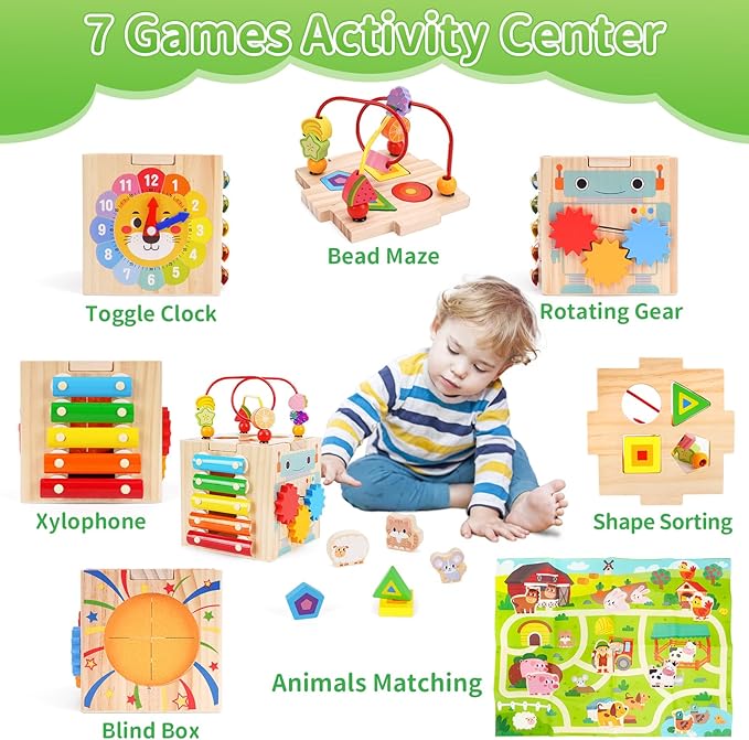 - 【Baby Activity Cube】Our wooden activity cube for 1 year old boy girl offers 8 playful modes: map matching, blind box, bead maze, xylophone, clock learning, shape sorting, rotating gears & block classification. This toddler educational toys 1-3 fosters logical thinking, & problem-solving skills through exploration.
