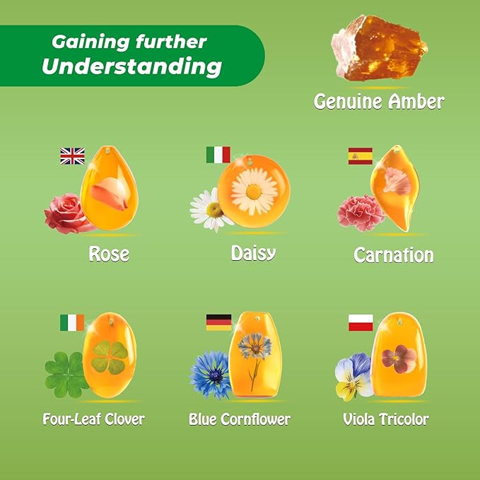 - 🌹[Abundant Kit Contents]🧰The EDUMAN Amber Dig Kit contains 1 digging block with 6 artificial plant ambers and 1 natural amber. Plant include Rose, Daisy, Carnation, Blue Cornflower, Four-Leaf Clover, Viola Tricolor. Also included are 1 hammer, 1 chisel, and 1 brush for digging, 1 collection pouch for storage, 2 necklace cords for making jewelry, and 1 instruction manual, providing comprehensive content.