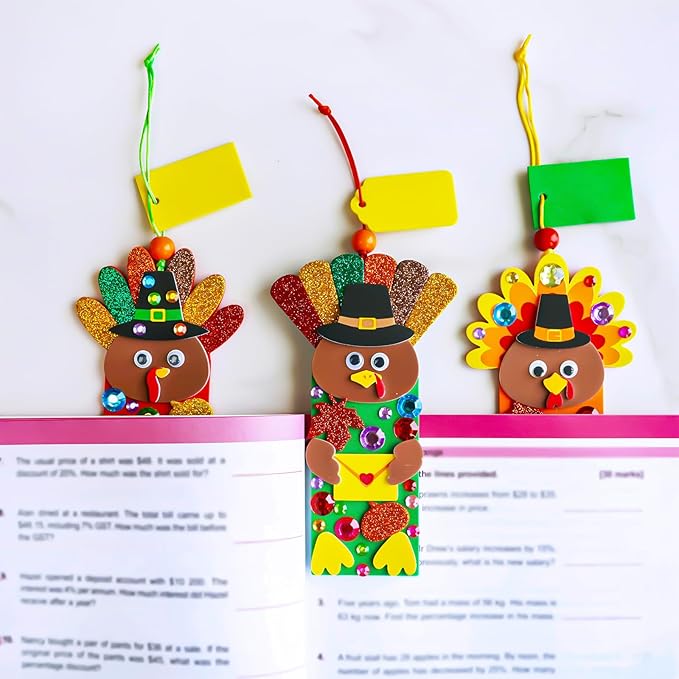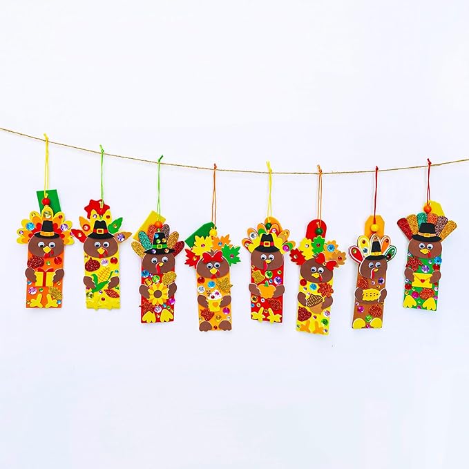 - Quality Materials & Easy Assembly: Crafted from EVA foam, these turkey craft kits offer a delightful crafting experience. The Thanksgiving foam stickers and googly eye stickers come with self-adhesive backing, ensuring a simple peel-and-stick experience. that's perfect for kids. To assemble the festive turkey bookmark ornament, simply attach a cord for hanging, embellish with assorted festive foam stickers and gem stickers, and finish off with a pair of googly eyes to bring it to life.
