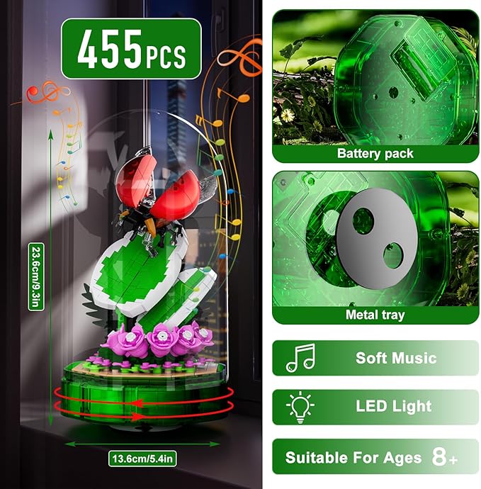 - Creative Insect-themed Building Blocks: This insect-themed mini building block toy consists of 455 pieces of particles, has a very beautiful overall shape, and comes with a transparent music display box